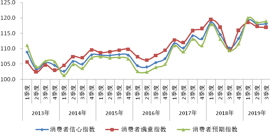 2019年3季度,消费者信心指数为118.1(见图1),比上季度提高0.1点,继续处于高位区间运行。其中,消费者满意指数为116.9,比上季度降低0.3点,下拉消费者信心指数0.12点;消费者预期指数为118.9,比上季度提高0.4点,拉动消费者信心指数上升0.24点。