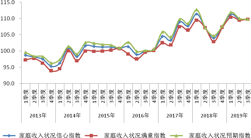3季度,家庭收入状况信心指数、满意指数和预期指数均为109.8(见图2),分别较上季度增长0、0.3和-0.2点。