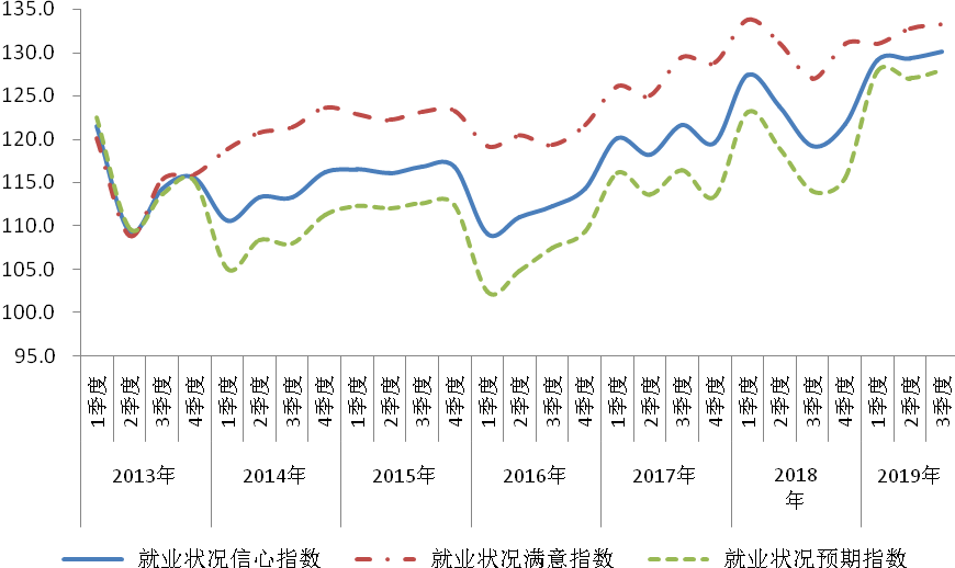 3季度,就业状况信心指数为130.1(见图3),比上季度提高0.8点。其中,就业状况满意指数为133.3,比上季度提高0.5点;就业状况预期指数为127.9,比上季度提高0.9点。