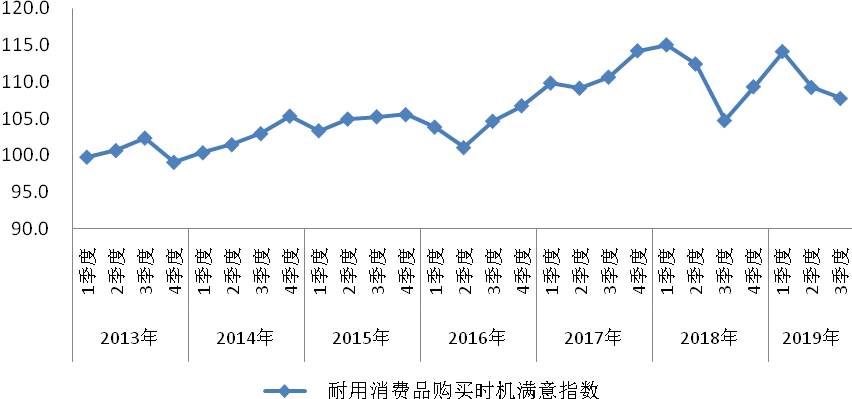 3季度,耐用消费品购买时机满意指数为107.7(见图4),比上季度下降1.5点。