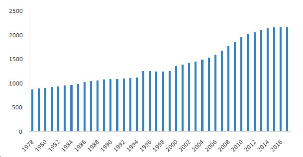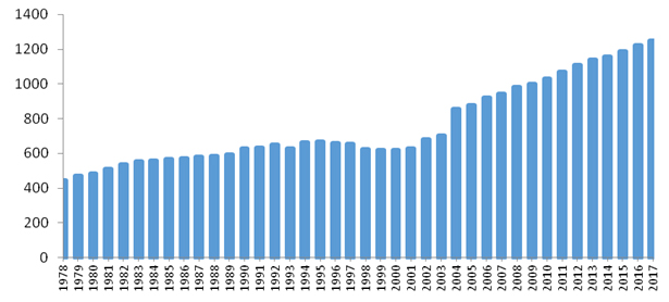 1978-2017年,全市从业人员从444.1万人增加到1246.8万人,平均每年增加20.6万人,年均增长2.7%。