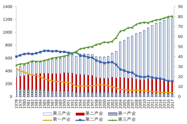 改革开放以来,全市第三产业比重不断提升,第一产业和第二产业比重下降,产业结构日趋合理。伴随着产业结构变动,就业结构也发生了变化。1978-1991年,从业人员就业结构呈现“二、三、一”格局,1992年末,第三产业从业人员比例首次超过第二产业,随后,第三产业从业人员占比不断提高,2017年末,三次产业从业人员比例为3.9:15.5:80.6。