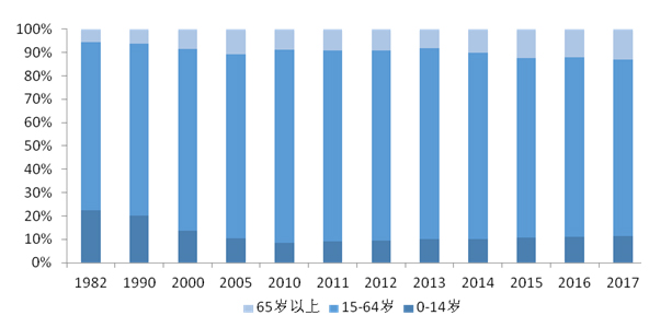 15-64岁人口比例则表现为先上升后下降的特点,从1982年的72%提高到2010年的82.7%,2011年开始,占比逐年下降,2017年为78.7%,与2011年相比,下降了3.2个百分点。