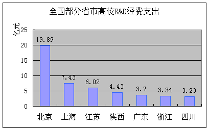 首都高校科技活动情况分析 ----北京市R&D资源清查分析之二 2000年开展的全社会R&D资源清查工作,比较充分详实地摸清了首都高校科研实力和资源储备。清查数据显示,首都高校科技人员整体素质较高,经费投入增长迅速,专著、论文、专利等科技成果丰硕,首都高校科技活动保持着活跃性和高速发展的态势。 一、首都高校科技活动的状况与趋势 首都高校科研活动一直是北京地区科研活动的重要组成部分,在全国高校科研活动中,也处于非常重要的地位。我们对这次清查数据进行了初步分析,对于2000年首都高校科研活动的状况与趋势可以得出以下几点结论。 1、首都高校继续在全国高校科技活动中占有重要位置 首都现有普通高校近60所,其中部委高校33所,学校的规模大、层次高,特别是清华大学、北京大学等学校逐步成为世界知名的高校。首都高校在人才培养、学术影响力等方面一直在全国高校中占有重要的地位。 根据这次R&D资源清查资料,我们对首都高校科研工作在全国的地位进行了分析。从科研活动人力资源、经费投入和产出成果等几个方面出发,确定科技活动人员、科研经费投入、承担研究项目数、研究机构、三大检索论文数等作为衡量科研实力的指标体系。从表1中各指标数据我们可以看出,首都高校在所列的8个指标上,基本占全国总数的1/5~1/4左右,在全国30多个省市自治区中均处于领先地位。R&D活动经费支出可以衡量一个地区科研投入力量和活跃程度的重要指标,从图1全国部分省市的比较来看,首都高校的R&D活动经费支出远远高于其他省市,反映出首都高校科研活动非常活跃。 从上述分析我们可以看出:首都高校在全国高校科技活动中同样占有重要的位置,并且仍然在全国处于比较明显的领先地位。 表1: