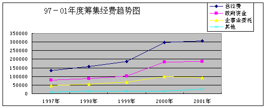 2、保持科技经费投入的高速增长,经费来源以政府投入为主 从时间序列数据看,首都高校科技经费投入在逐年增加,1997年的13.32亿,2001年达到了30.66亿,五年时间增长了2.3倍,平均增长率24.8%。首都高校科研投入的保持了高增长趋势。 1997-2000年高校科技经费筹集情况表 表三: 单位:万元