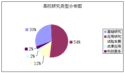 从图4我们还可以明显看出,在高校的科技活动经费中,政府经费占了很大比例,一般保持在60%左右,企事业委托经费大约30%左右。比如:2000年科技经费筹集额中,政府资金占61.72%,企业委托资金占28.72%;R&D经费内部支出中,政府资金占59.10%,企业资金占29.80%。这说明,首都高校科技活动经费的来源中,政府部门科技经费是主要来源。 3、研究方向主要侧重基础研究、应用研究 与其他科研部门相比,高等学校的研究方向有自己的侧重。在2000年R&D活动中,R&D人员投入,基础研究人员占33.44%,应用研究人员占55.78%,试验发展人员占10.78%。R&D经费投入在基础研究、应用研究和试验发展的比例大约是2:6:2;全市大约为1:3:6,科研院所大约是1.5:2.5:6,企业大约是0:2:8。从投入看,首都高校在基础研究和应用研究方向上的投入较大,其他系统主要在试验发展方向进行投入。 在2000年首都高校的科研项目中,基础研究2474项,占总数的30%,应用研究4366项,占总数的54%,两项合计占总数的84%。 上面的数据表明,首都高校的科技活动主要侧重基础研究和应用研究,与科研院所和企业的科技活动形成一定的互补,共同承担北京市的科学研究任务。 高校系统研究方向与其他系统比较 表四: 单位:千元、%